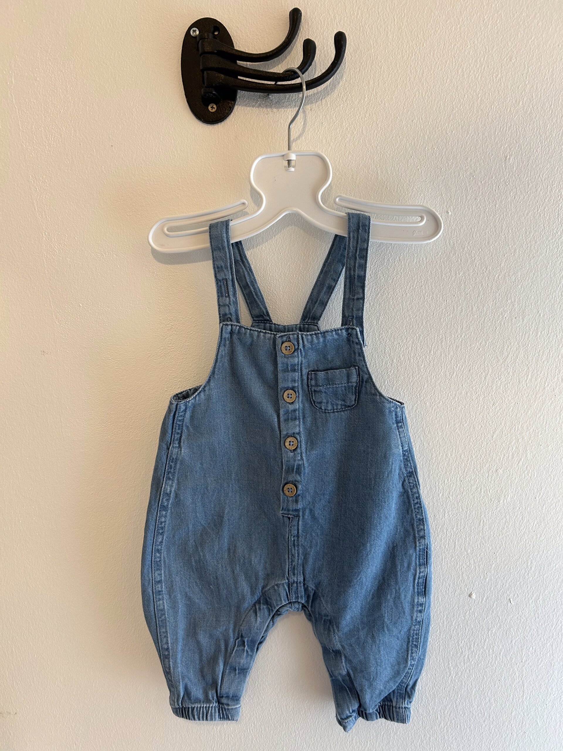 Begagnad blå jeans-hängslebyxa i stl 62. Märket på plagget är Newbie.