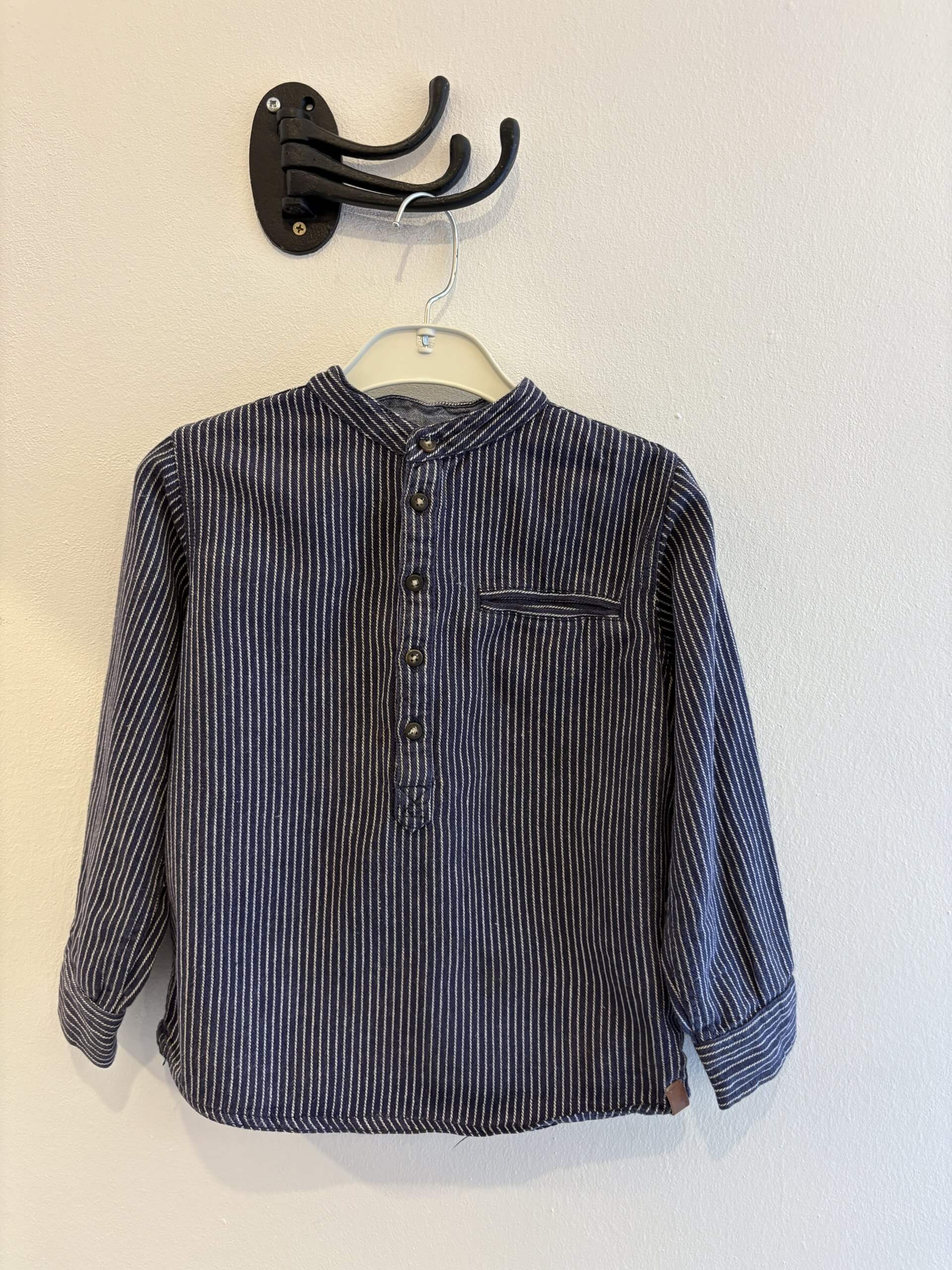 Fin blå/vitrandig skjorta i stl 104 med murarkrage och knappar fram.