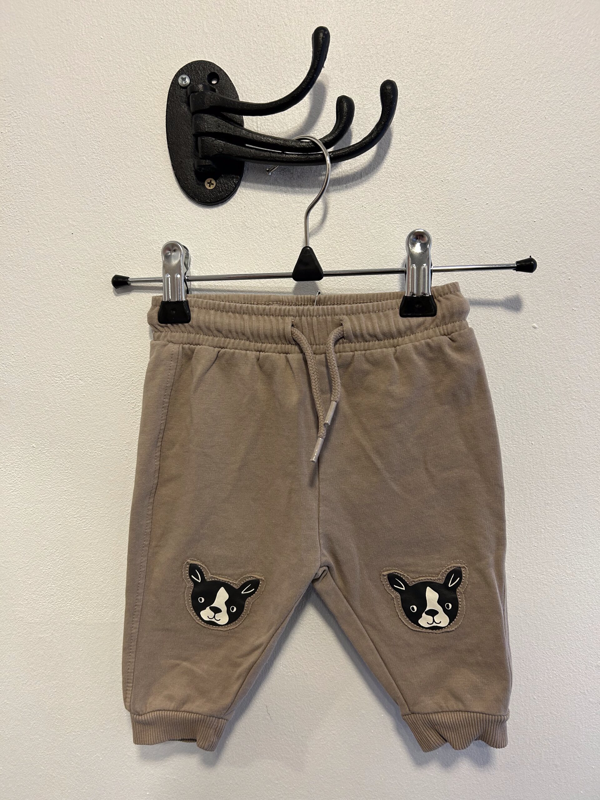 Brun/beige byxa med hundansikte på knäna i stl 62. Plagget kommer från Kappahl, varsamt använda, mjuk och behaglig kvalitet. Resår och snodd i midjan.