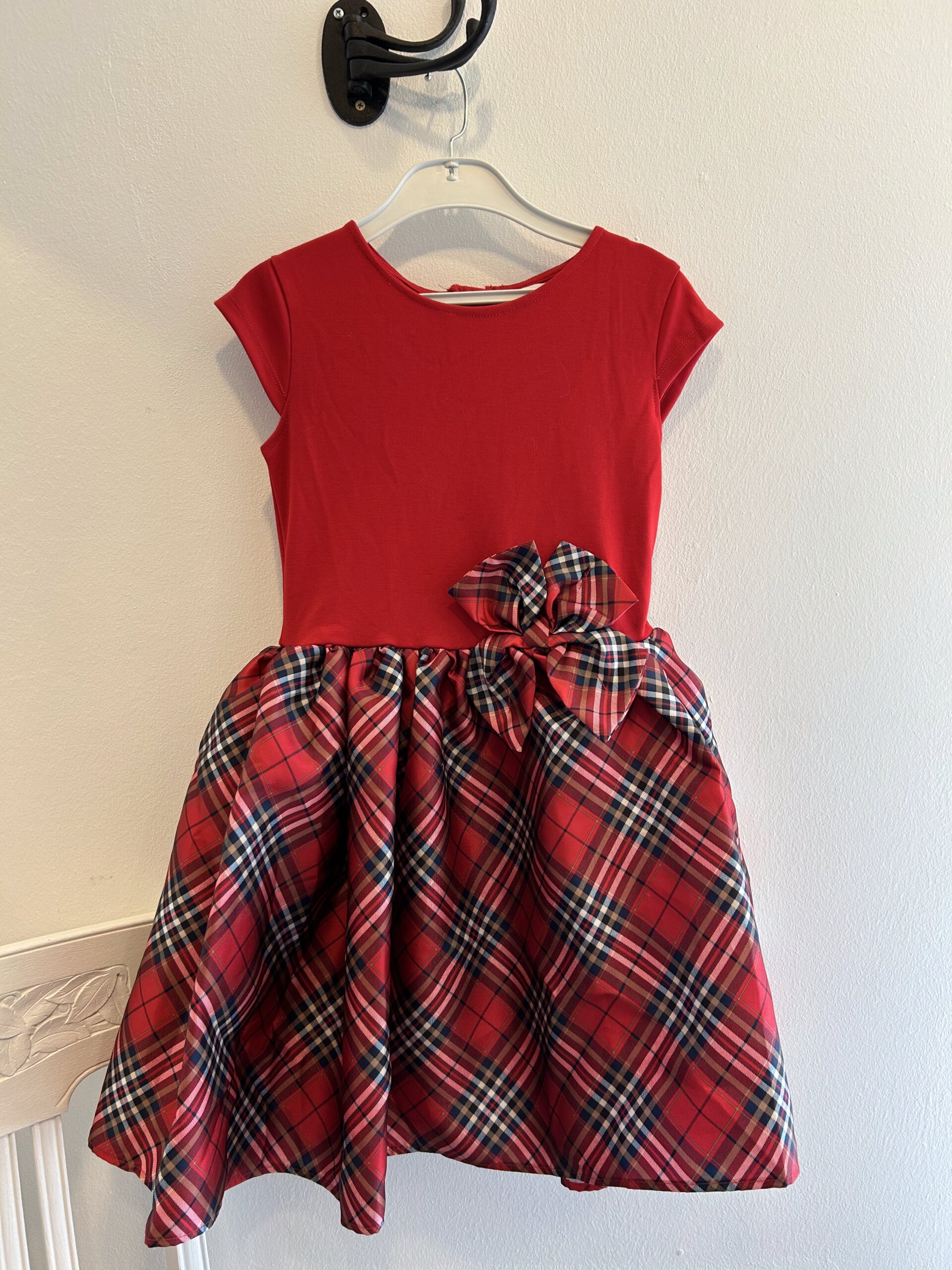 Begagnad röd/skotskrutig klänning i stl 134/140. Plagget kommer från H&M. Klänningen är i behaglig kvalitet och fint skick. Korta ärmar och fint klockad skotskrutig nederdel.