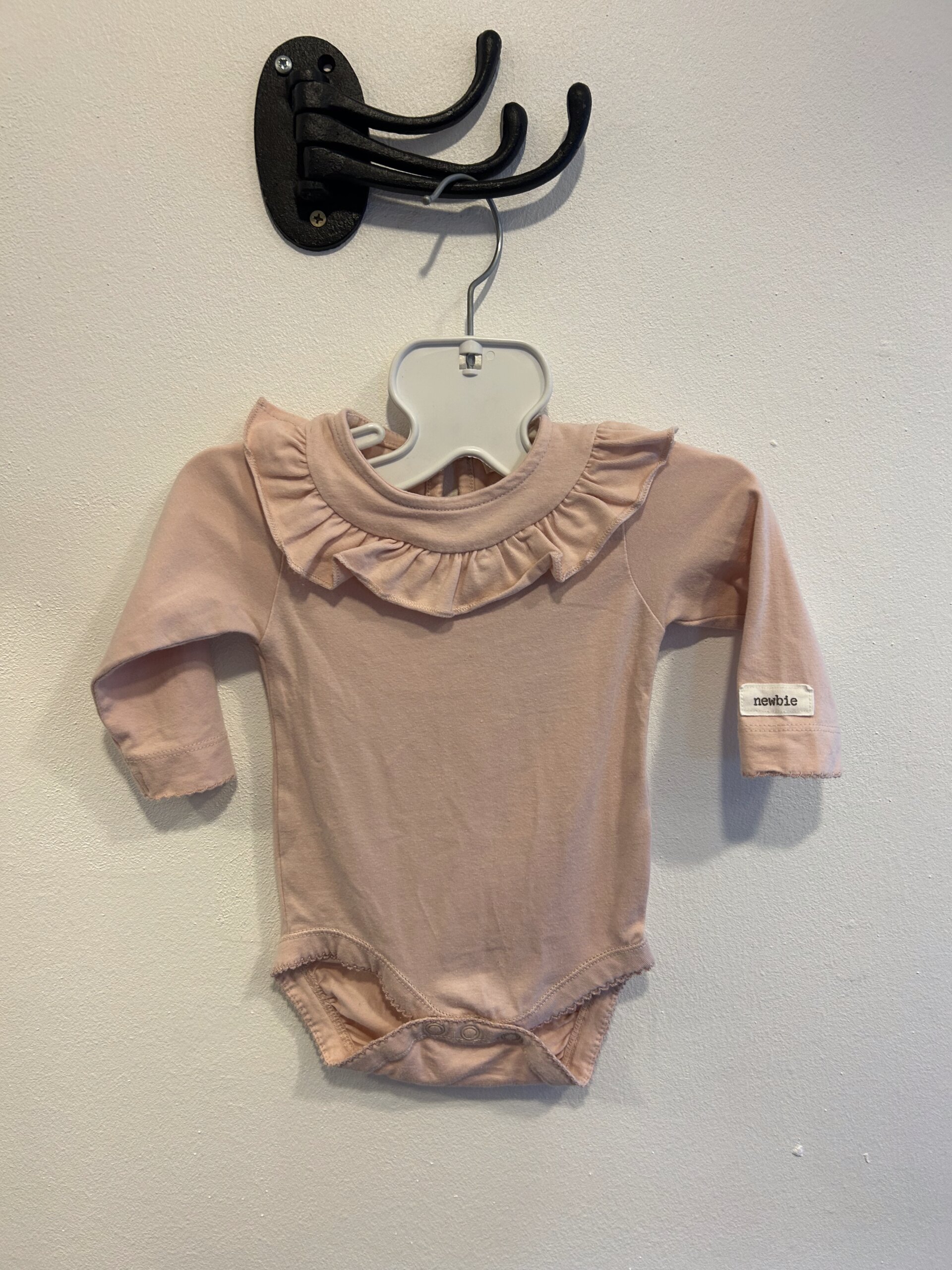 Fin rosa body i stl 56 med långa ärmar och med volang runt halsen. Bodyn kommer från Newbie och är i fint begagnat skick och mjuk kvalitet.